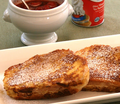 Thick slices of bread - stuffed with sweetened cream cheese - soaked in egg/cream batter - pan fried in butter - and sprinkled with both powdered sugar and cinnamon sugar. Note the additional toppings in the background - Strawberries and Whip Cream in a can (just for the record, I can..and often do...make my own whip cream - but I like the canned stuff too!)